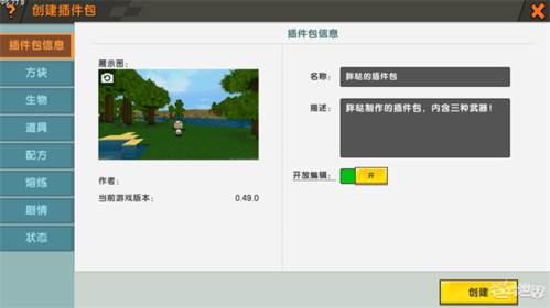 在这里我们需要输入插件包的名称和描述,并且可以截取游戏内的截图当做封面。冒险家们还可以设置开放编辑的开关哦,开启开关后,其他小伙伴下载了这个插件包后可以二次重新编辑插件包内的内容。