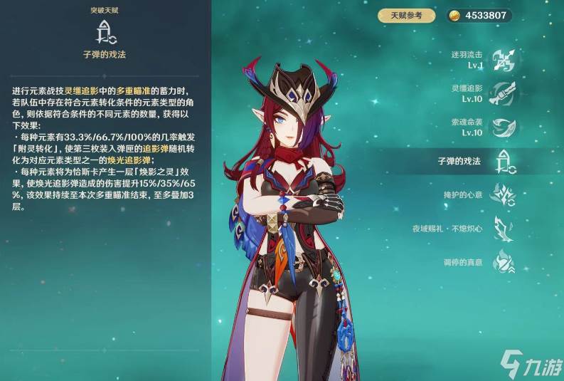 当恰斯卡的队内每携带一个不同元素的角色时,恰斯卡的后三发子弹会按照随机的顺序转换成对应的元素。在六枚子弹中的第三发会根据元素种类的多少来获得对应的概率进行转换成任意一个元素,队内元素种类越多第三枚子弹转换元素的概率会越高且第三发的伤害也会更高,前两发子弹则是恰斯卡自身的风元素。根据这一点不难看出开元素战技后重击发射子弹是恰斯卡的主要输出手段,并且队伍内的角色元素越丰富越好,提高子弹元素的转换率,触发更加丰富的元素反应伤害。