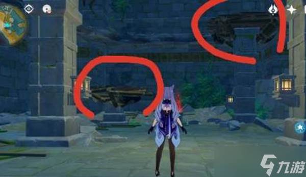 4、随后来到第三个塔的位置,此时玩家需带着刻晴或岩系角色,然后在规定时间内来到第三层并利用台子跳上去,即刻晴E,或岩系角色E垫脚上去;