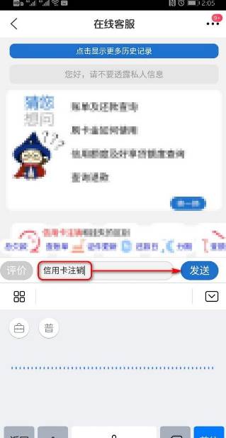 进入在线客服主界面,在信息框内输入:信用卡注销,然后点击发送。