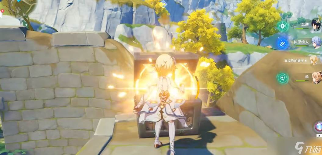 水位下降后,宝箱周围会出现风屏障,需要找到三个仙灵才能解除。第一个仙灵就在方碑附近,很容易发现。第二个仙灵在遗迹底部,旁边有遗迹守卫把守,如果不想硬拼,可以绕开怪物直接引导仙灵。第三个仙灵被关在对面建筑的铁门里,需要完成限时挑战,击败四只水史莱姆才能开门。仙灵会飞到二楼,爬上去跟着它就能带回最后一个位置。