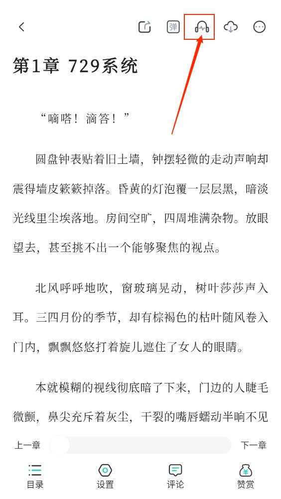 3、进入阅读页面点击中间区域呼出菜单,然后点击"听书"图标,如图。