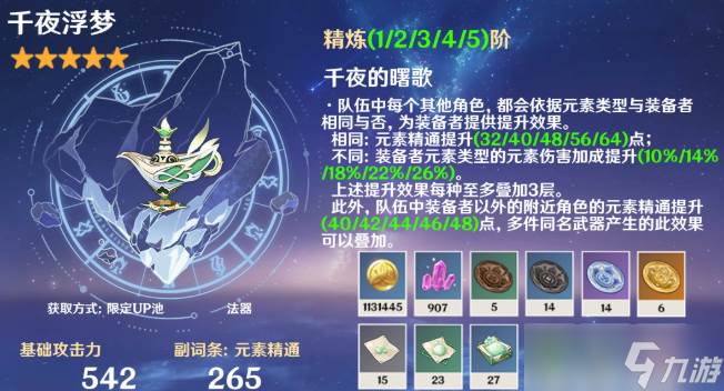 3、技能效果:队伍中每个其他角色,都会依据元素类型与装备者相同与否,为装备者提供提升效果。相同:元素精通提升(32/40/48/56/64)点;不同:装备者元素类型的元素伤害加成提升(10%/14%/18%/22%/26%)。上述提升效果每种至多叠加3层。此外,队伍中装备者以外的附近角色的元素精通提升(40/42/44/46/48)点,多件同名武器产生的此效果可以叠加。