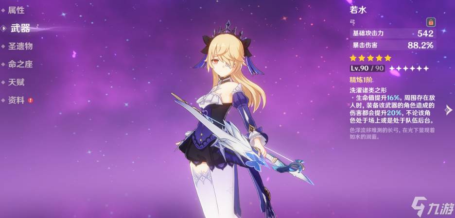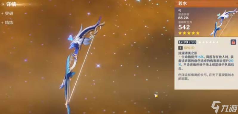 若水基础攻击力为五百四十二,副词条效果是提升百分之八十多的暴伤,是目前对暴伤提升最大的弓箭武器。这把武器特效有两个,一是提供无条件的生命值提升效果,二是附近有敌人时不管装备者处于前台还是后台伤害输出能力都会得到提升。当前大多数角色都属于近战角色,所以能轻松吃满武器特效,只有少数角色,比如说甘雨通过远程重击的方式输出,可能无法完全吃到武器效果。