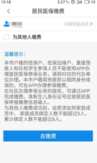 可以选择为家人缴费,低保户、学生需要去社区缴费。