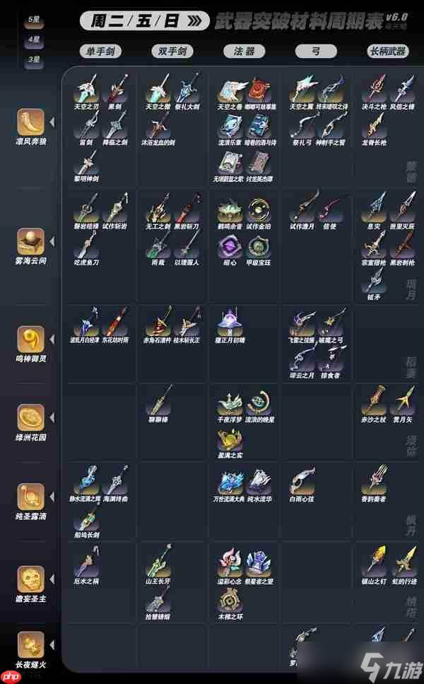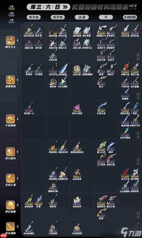 同时涵盖当前全部5星、4星与3星武器升级所需材料的秘境掉落信息(限时开放),均已收录于下表。