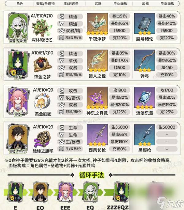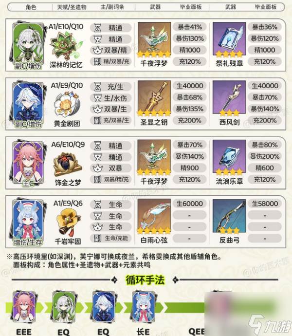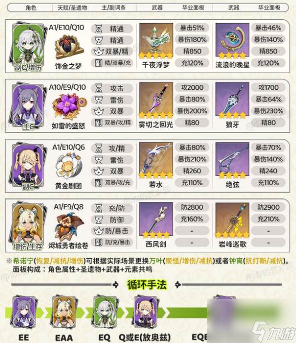 c. 替换角色- 芙宁娜 可替换 行秋 ,可以根据面对的敌人,调整 艾尔海森 的那个位置的角色,比如:盾或者雷后台(这种时候就需要 纳西妲 站场,同时 纳西妲的精通 可以降低,多一些双暴词条)。