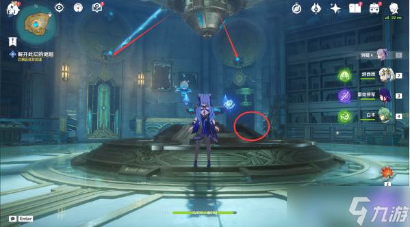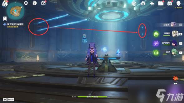 12、在这里使用水母的力量交互中间的机关,可以先打开这个需要两根激光开的门,进入房间内拾取到根源之轮*1,之后交互这个位置的机关后,最上层的激光可以达到最高位置,如下图: