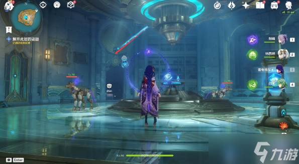 6、乘坐这个电梯来到下层,先把右侧的那个敌人打了,之后要借助章鱼的力量旋转交互中间的晶石,然后使用这个机关调整一下头顶的机关高度,如下图: