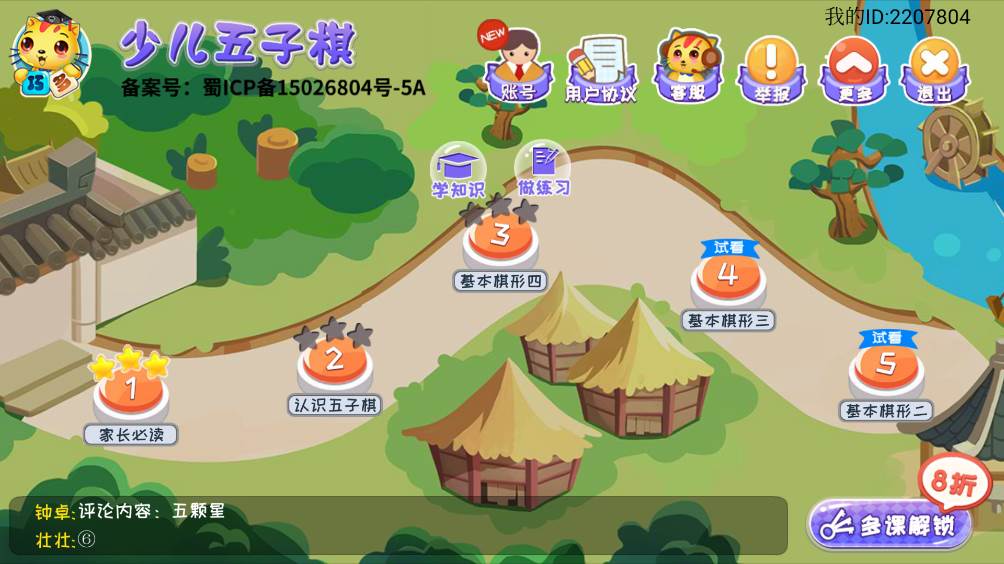每课结束通过儿歌总结的方式,让孩子轻松且不乏味的记住课程要点,并配合课后练习,对所学知识进行复习和巩固。还有五子棋人机对弈功能,让孩子运用所学。