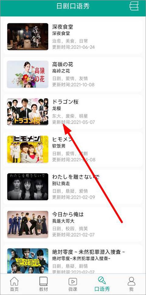 4、口语秀页面中包括深夜食堂、高岭之花、我是大哥大、龙樱的经典热门日剧片段,用户可以选择片段进行配音,提高自己的口语表达能力。