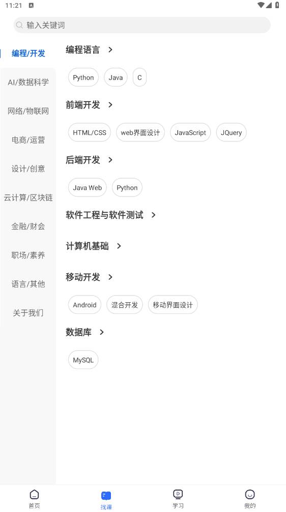 2、输入课程关键词搜索,可以快速找到学习的课程;