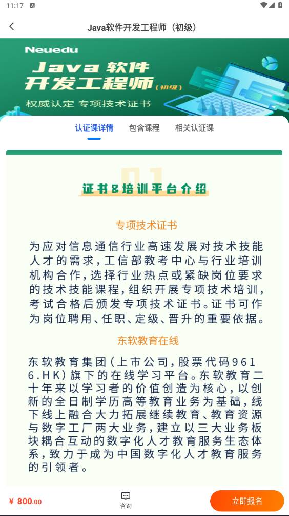 3、这里小编就以Java软件开发工程师课程为例子,点击进去即可查看课程详情、包含课程以及相关认证课和课程价格;