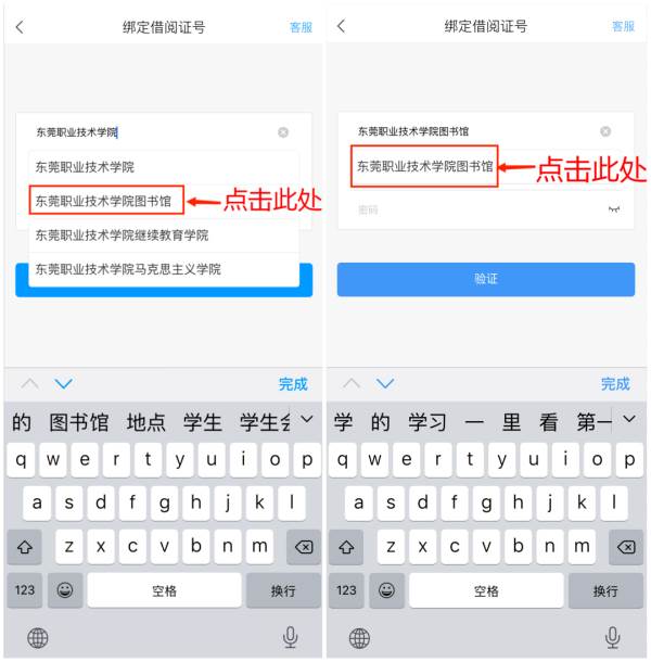 注意:一定要 点击下拉框里出现的“学院图书馆”,才会跳转到下一步绑定的界面(如果只是手动输入信息而不是点击下拉框的选项,是无法跳转到下一步的)。