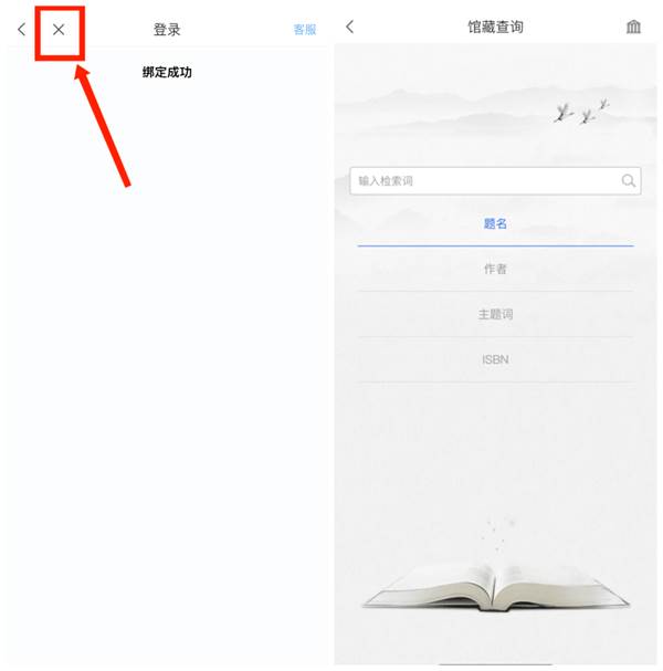 7、绑定成功后点击左上角的 ×,即可使用“馆藏查询”和“借阅记录”功能。