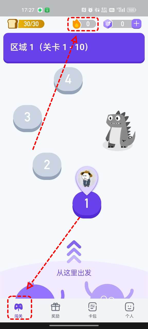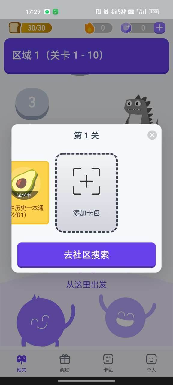 5.添加到卡包之后再进入闯关界面并点击我的头像进入第一关,然后之前添加的卡包就会变成一道道关卡