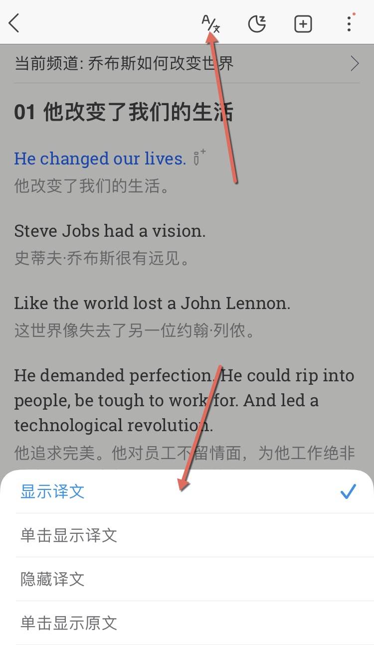 3)点击播放页面顶部译文设置按钮,查看译文显示状态。