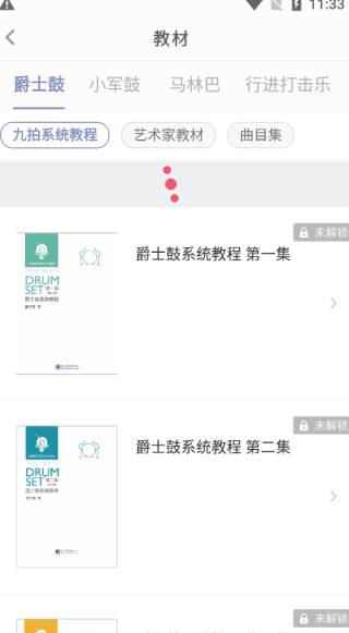 App的电子商城中除了可以购买乐器及附件产品,还可以购买九拍爵士鼓、吉他、贝司、行进打击乐、马林巴、小军鼓等各个学科的系统教材及全国社会艺术水平考级教材,通过教材扫码解锁功能,在App中可以解锁教材中所有的示范音频和伴奏音频