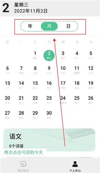 1、打开软件进入主页面,点击这里这里设置年月日,记录孩子每一天的默写情况