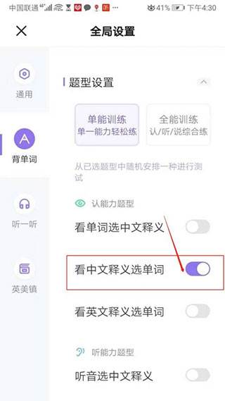 4、进入全局设置页面,点击背单词右边的题型设置;