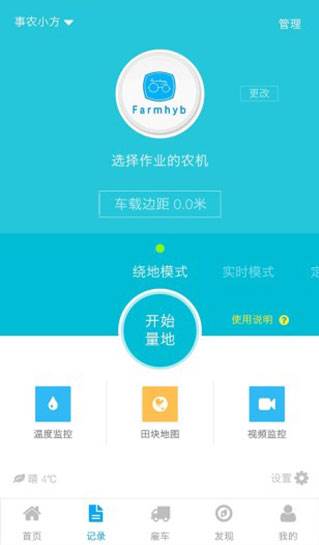 2、切换到【记录】页面之后,我们还能各种实用的功能,如绕地量地、温度监控、田块地图、视频监控等。