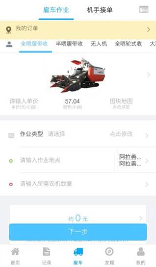 3、而在【雇车】页面,我们还能发布各种农机作业订单,只需要填写各项参数,即可计算出大致的订单价格。