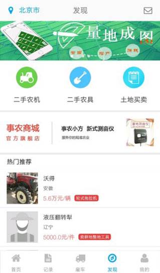 4、【发现】页面则为我们提供了各类农机、农具、土地方面的交易服务,点击中间部分还可进入到事农商城官方旗舰店。