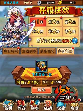 第一天礼包飞雪装,买不买看个人喜好,开服时间越久400金越不值。第二天8个宝箱400元宝,因为商店的宝箱价格是递增的,第一个宝箱价值30金,8个宝箱半价实际上是比商店出售的价格便宜的。第三天精炼石必买,10元宝一个精炼石,价值永固。第四天的天命石看个人需要决定买不买,花费1500金。第五天的2000将魂半价比较超值。顺便说一下将魂,一个橙将80个碎片,决定国家之后神将商店刷出碎片,本国橙将一定要买下,一个不落,凑缘分突破都要用到,因此1个武将决定一个国家是很仓促的,慢慢决定阵容才是上策。