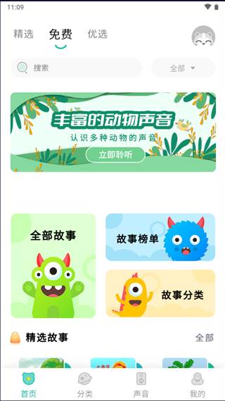 1、首页:有着众多精选、免费故事,你还可以在上方搜索栏中精确搜;