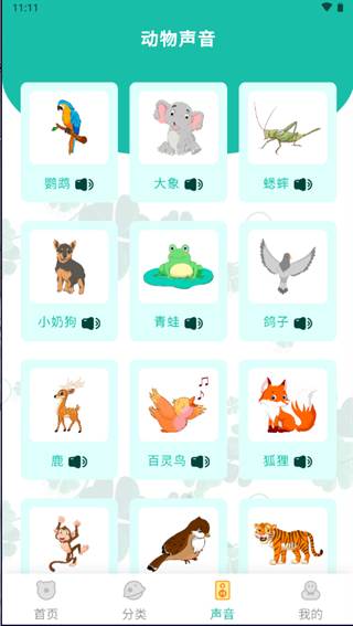 3、声音:你可以在此页面里给孩子听动物叫声;