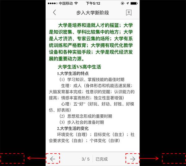 在章目录页面,点击页面名称,进入课程学习页面(见下图)。您可以直接点击屏幕左下方或右下方的按钮切换学习页面。