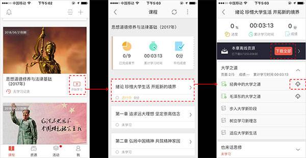 在课程菜单下,学生可以看到已激活的所有课程。点击课程封面或者“开始学习”图标可以查看课程目录、课程的累计学习时间和平均成绩等。点击章名称,进入章目录页面,再点击“下载全部”按钮可下载本章所有资源;也可以点击每个页面右方的下载图标,下载单个页面中的资源(见下图)。