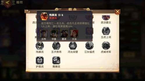 2、阵容组合:敌方每死亡一名士兵,组合内主将获得强化,3人上阵强化效果提高50%。吕布一个就有残暴的能力,不过三个人的话就可以强化这个力量。