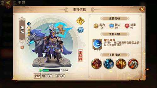 (4)按上上述的搭配就还剩下两个位置可以选择,那么此时小编极力推荐大家大家张辽。虽然张辽的羁绊不能喝在场的角色进行组合,但是张辽的技能十分契合这个队伍,他的综合能力是最为出色的。尤其是他的第一个技能昂扬,有了这个技能马超突破前排的速度会更快,并且突破前排之后还能带来更多加成,基本上只要能冲到后排,那么敌人基本就没了。