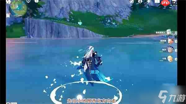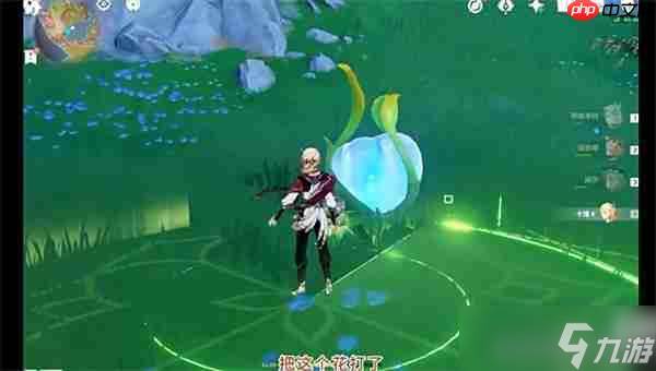 2、根据小地图指示,朝西北方向前进,寻找一朵显眼的蓝色发光花朵,使用角色攻击将其激活。