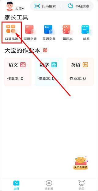 1、 打开作业精灵,进入软件后在主页我们就能看到口算批改、汉语字典、英语字典、错题本等家长工具,点击“口算批改”进入;