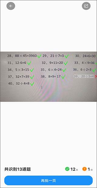 3、最后等待系统数秒,即可快速高效的批改孩子的口算作业,识别正确率也是非常高的,如果有多页也可以直接点击“再批一页”进行拍照。