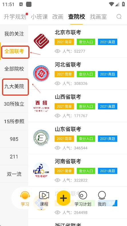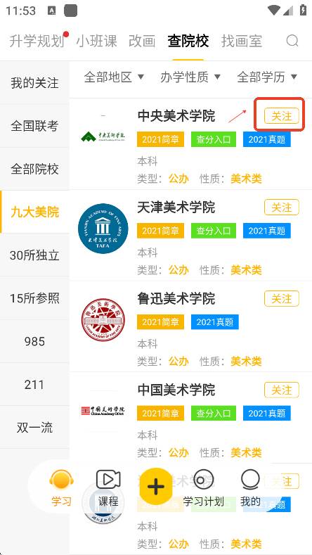 用户们可以关注各大院校,或者直接关注全国九大美院