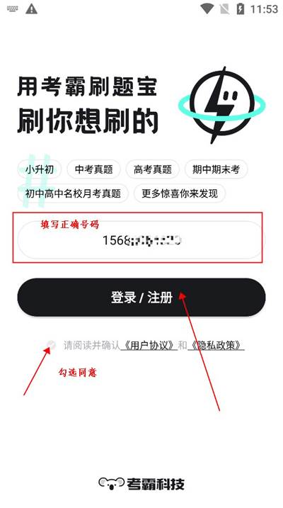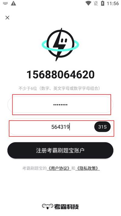 3、设置好自己的登录密码,然后获取验证码,点击注册考霸刷题宝即可成功注册账号啦