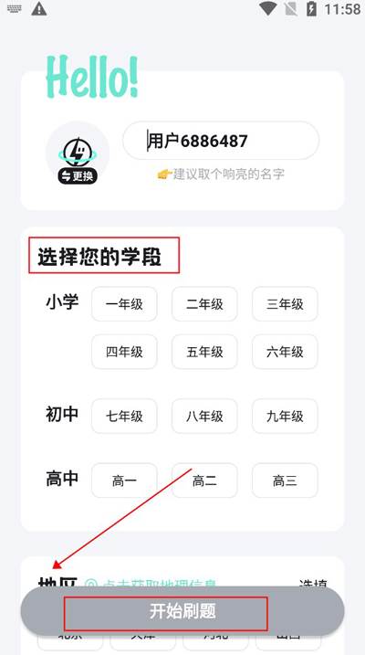4、进入首页后选择自己的学段和地区,点击开始刷题即可使用软件