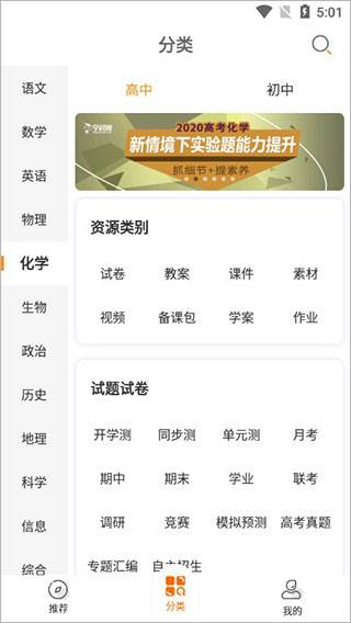 5、在分类界面,有初中-高中所有科目的资源、试卷、视频等教学。