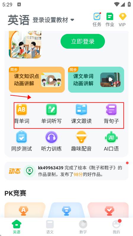 设置完所学教材后,学生们可以在app中对学校课程进行同步学习,巩固每天所学知识点(英语方面可以进行单词口语练习和课文朗读练习等)。