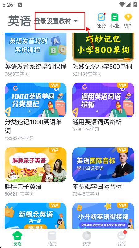 进入app后,学生们需要先登录,后才能设置所学学段学科教材。