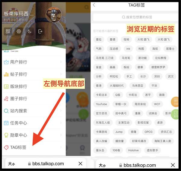 可以在首页左侧导航页,划到底部点击“TAG标签”来浏览近期的标签~