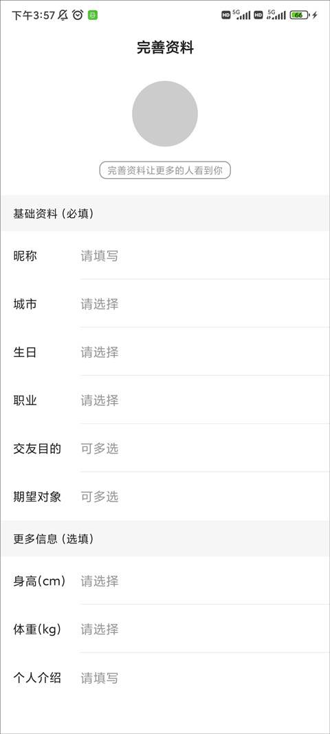 2、之后你需要完成资料的填写,像头像、昵称、城市、交友目的等等。
