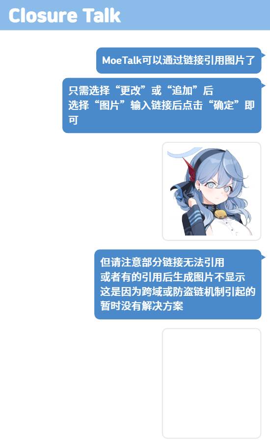 MoeTalk尘白禁区是MoeTalk的延展版本,这个版本拥有联网版本,无需网络的离线版本,此版本可以模拟与尘白禁区中的角色进行AI对话与聊天,内容丰富真实,并且无需联网就可以体验,喜欢的千万不要错过此版本。