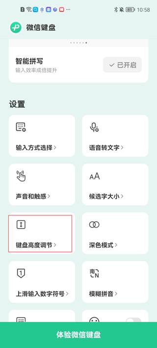 1、首先打开微信键盘app,往下滑至 键盘高度调节 这一选项