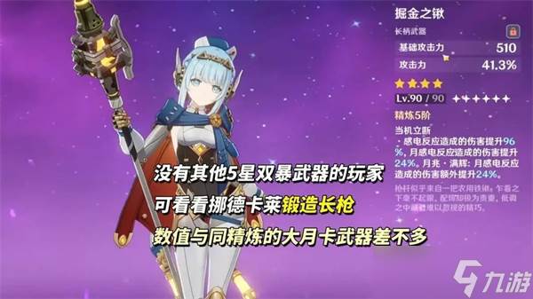 常驻5星「和璞鸢」和挪德卡莱锻造「掘金之锹」。圣遗物可刷「穹境示现之夜」,主词条“攻、攻、暴伤”,副词条“暴击、暴伤、充能、精通”。优先确保130%充能、2000攻击、接近100%暴击200%暴伤,再考虑精通。注意套装有30%暴击率,避免暴击溢出。
