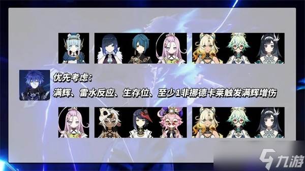 需满足:雷队友降充能、水队友触月感电、双挪德卡莱角色凑满辉、非挪德卡莱角色触发增幅、生存位。