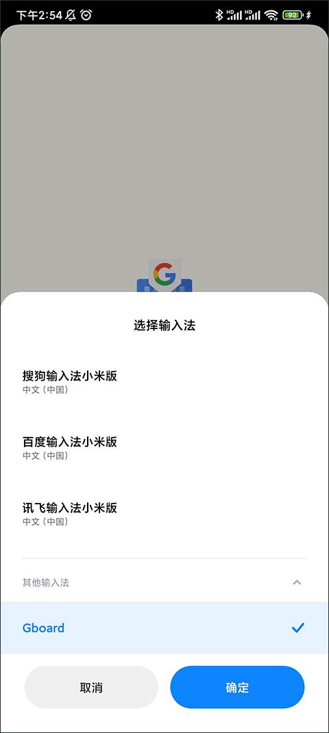 我们点击屏幕中的选择输入法,这个时候会跳出来一个弹框,让我们选择使用的输入法,我们在其他输入法内找到Gboard点击勾选它然后再点击确定就设置好了